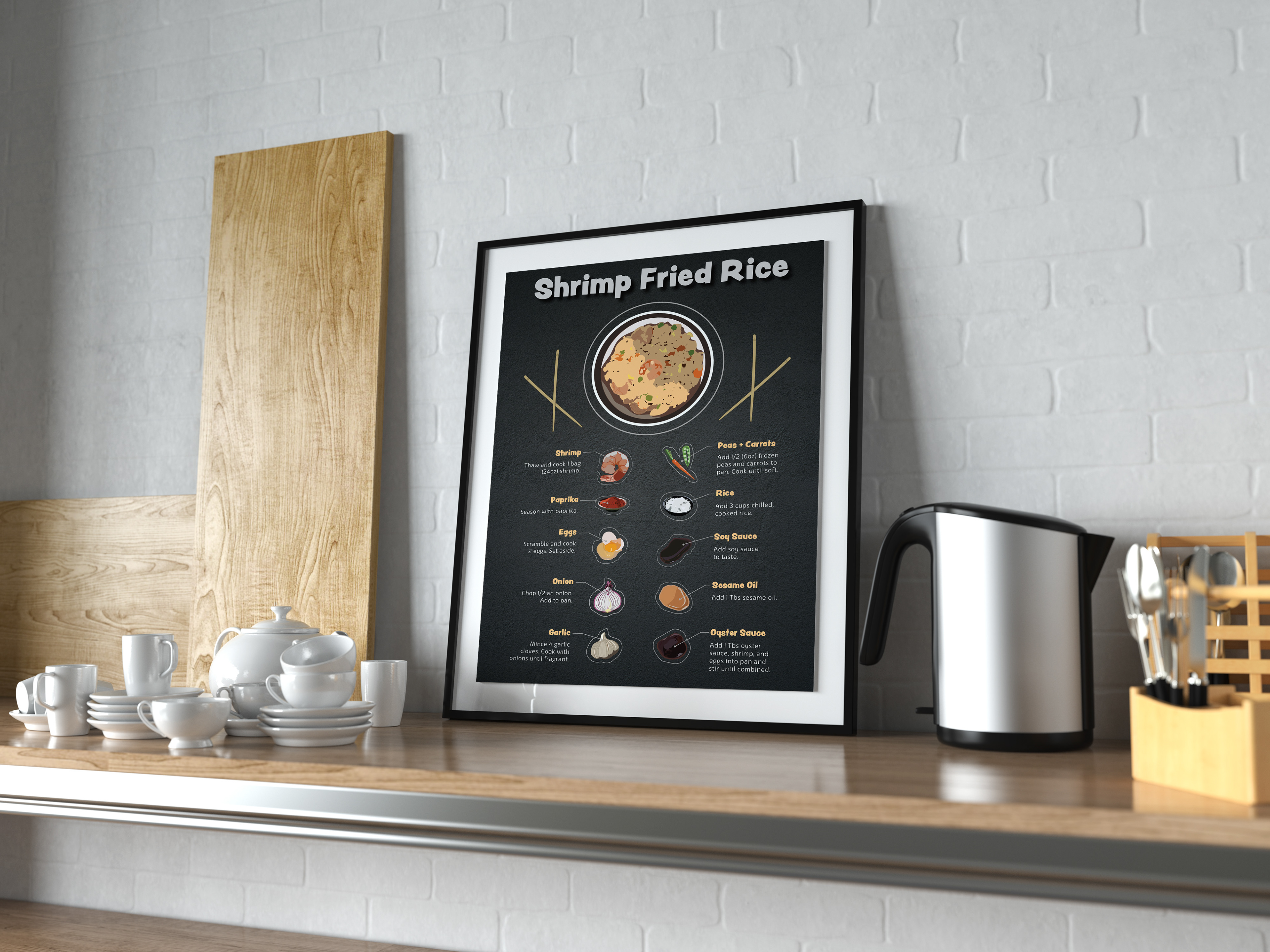 This recipe infographic is another example of my digital illustration expertise. I created the recipe poster as well as the illustrations for each ingredient and the final product of shrimp fried rice, all with the intention for others to put this in their kitchen and use it as if it came from a cookbook.